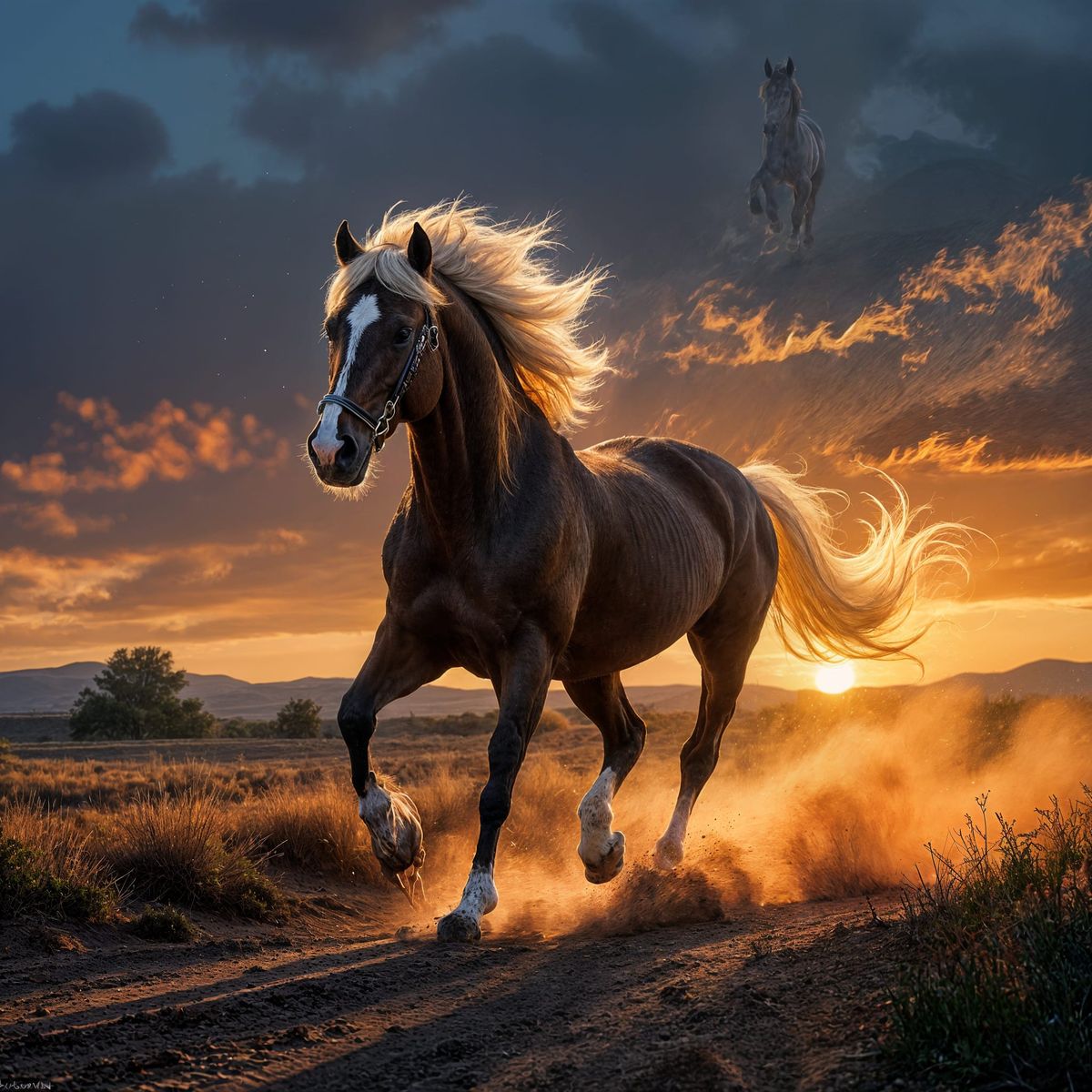 A striking image of a horse engulfed in flames, running powerfully along a dirt trail. The scene captures intense motion and a dramatic, fiery aesthetic.