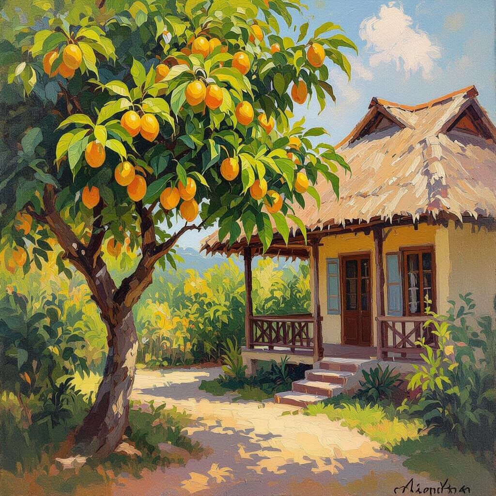 A vibrant mango tree stands next to a quaint bungalow with a thatched roof. The image features bold brushstrokes and warm colors, reminiscent of impressionist oil paintings.