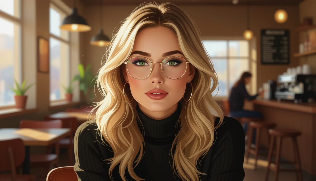 This image shows a stylish blonde woman with glasses in a modern coffee shop. The scene features warm lighting, soft shadows, and a blurred background, captured with highly detailed textures and a realistic atmosphere.