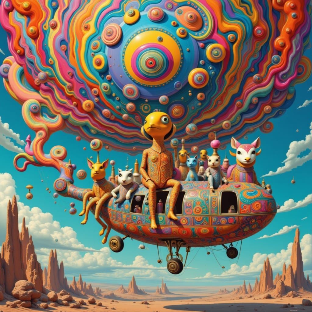 This image shows surreal, bizarre creatures in vibrant psychedelic uniforms, piloting flying balloon helicopters through a dreamlike, colorful sky.