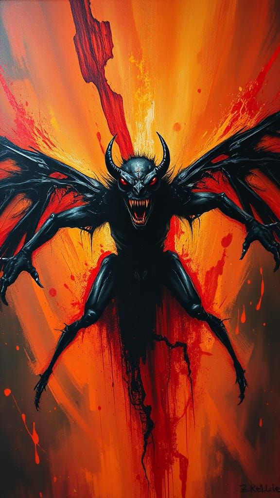 A dark, surreal oil painting with orange and crimson colors. The artwork depicts a scene of intense horror and frantic energy, rendered with sharp detail and a sense of depth.
