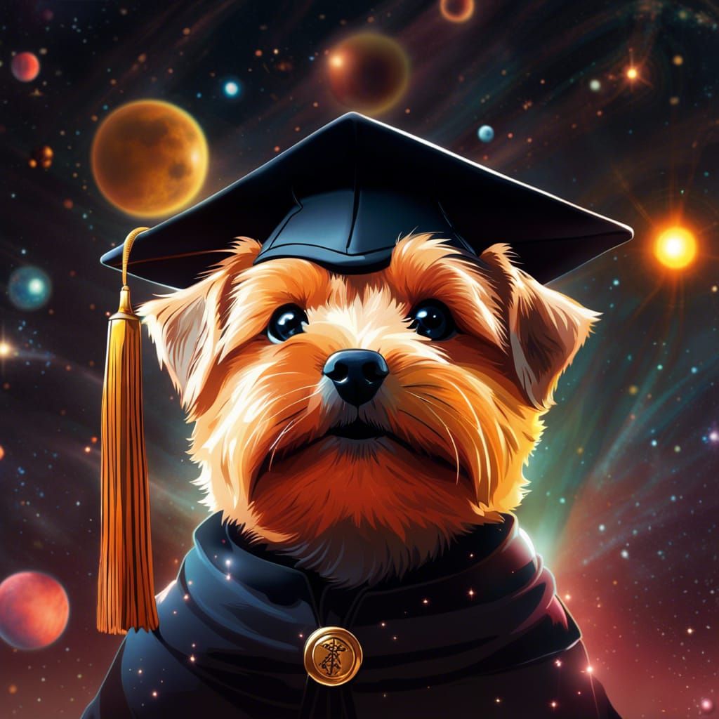This image shows an anthropomorphic Norfolk terrier graduating in a cap and gown against a space background. The style is reminiscent of digital art with hyperdetailed features and rich colors.
