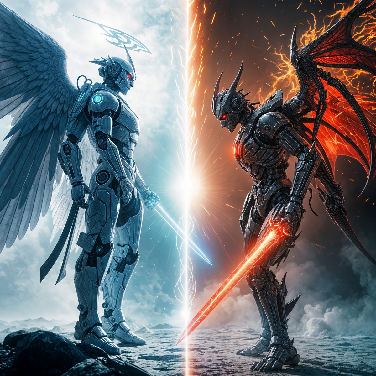 This image shows a futuristic battle between a robotic angel and a cybernetic demon. The scene is hyper-realistic with intricate details, emphasizing the contrast between light and darkness in a cinematic style.