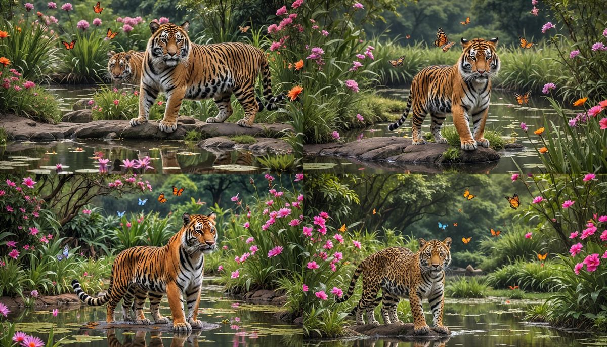 Explore the wonders of the animal kingdom by photographing wildlife in their natural habitats, from majestic big cats to delicate butterflies.flowers ,near a pond,