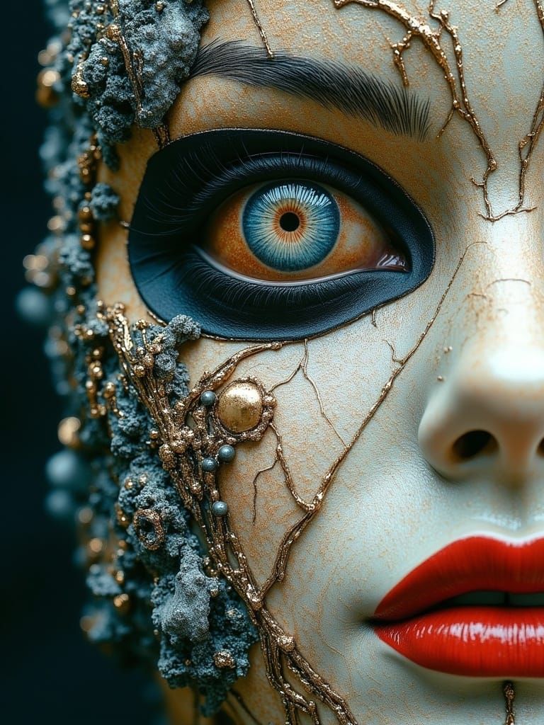A striking 3D sculptural collage with porcelain skin. This eye-catching composition blends lost dreams and found objects in an eerie, sparkling scene with depth and dimension.