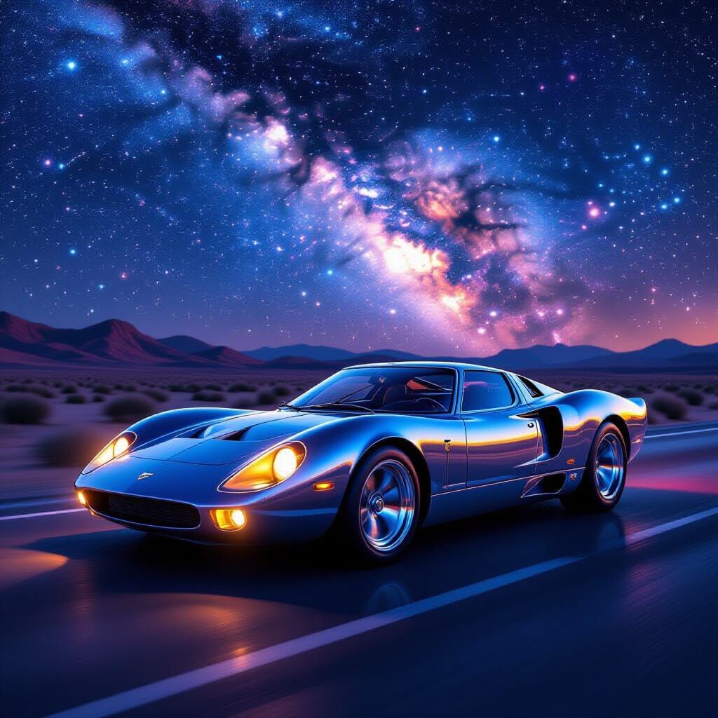 This image shows a vintage luxury sports car driving along a desert highway. The car has a glossy metallic finish and neon accents, set against a swirling, cosmic sky as hyperrealistic digital art.
