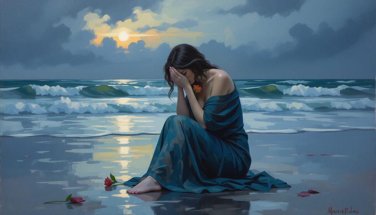 This image depicts a voluptuous feminine figure seated on wet sand during a stormy dusk. Rendered as a moody, cinematic oil painting with thick, textured brushstrokes and dramatic lighting.
