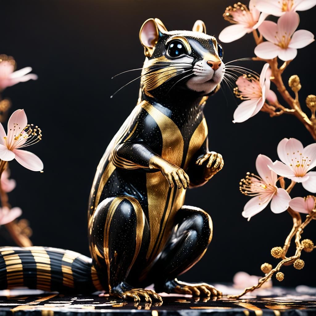 This image shows a metallic chipmunk with gold accents standing among marble cherry blossoms. The artwork is rendered with a dramatic lighting, vivid colors and intricate details, in an Art Deco style.