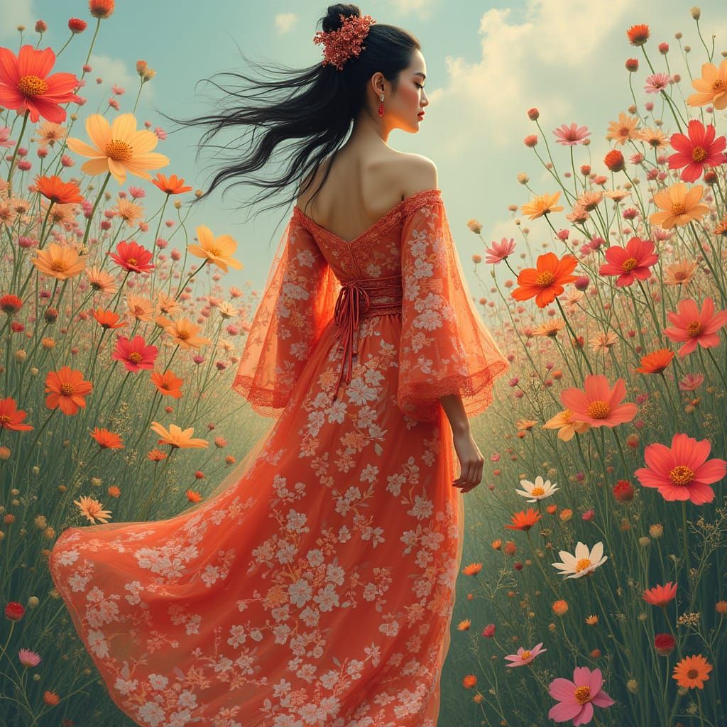 Easily generate your own beautiful images of Asian women in flower fields. It's free and easy!