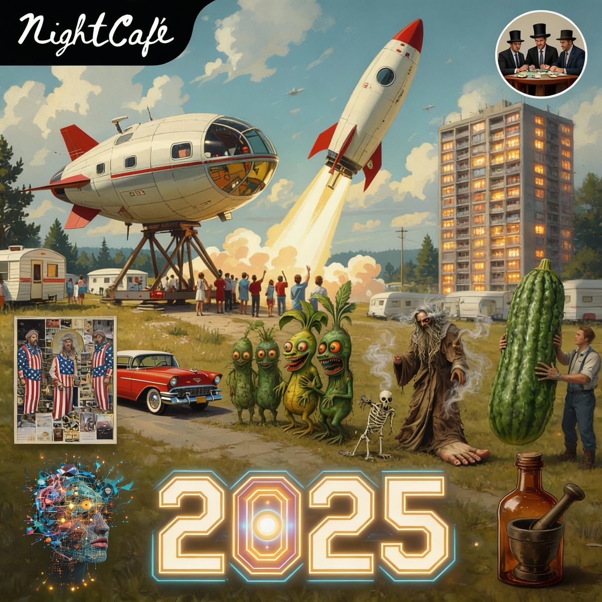 This AI-generated image features a seamless blend of multiple subjects from various artworks into a cohesive scene, incorporating a logo, avatar, and "2025" text.