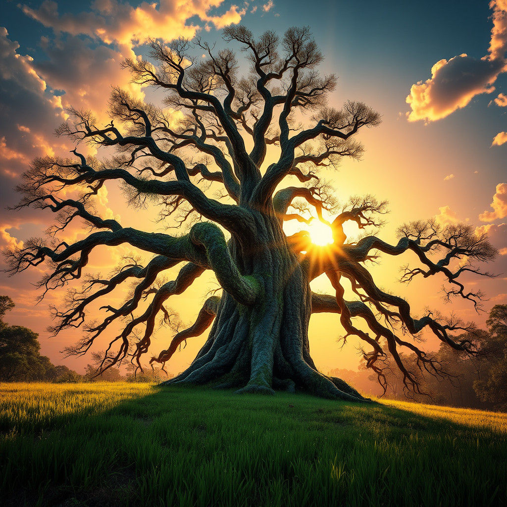 A striking picture of an old tree at sunrise. The image evokes a sense of wonder with long shadows and sun rays glinting off the moss-covered bark, in a fantasy concept art style.