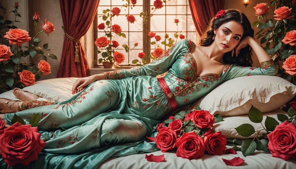 A striking picture of an exotic woman reclining on a bed of roses. The ink and watercolor illustration uses a warm triadic color palette to create a sensual, dreamy effect.