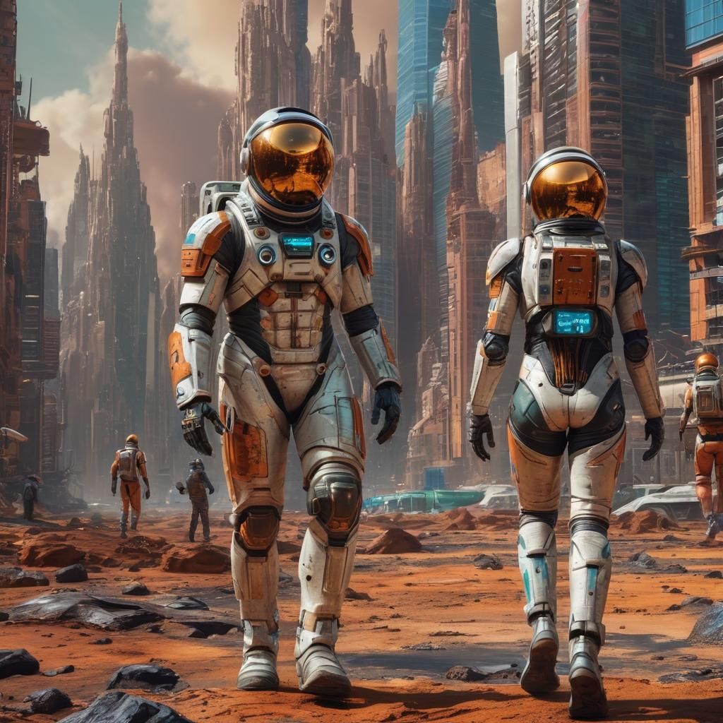A vibrant acrylic painting of a futuristic city on Mars. Humans in spacesuits walk near towering skyscrapers, all rendered with dynamic brushstrokes and a warm, realistic color palette. Harsh sunlight reflects off the Martian dust.