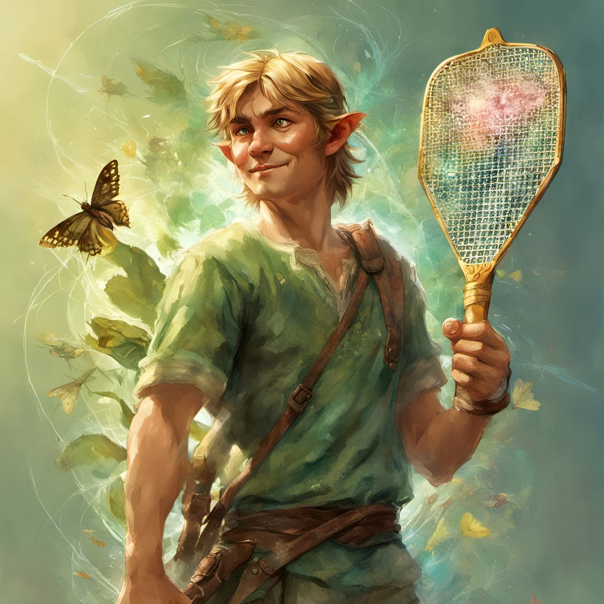 A digital portrait of Link wielding an electric fly swatter. The illustration has a vibrant background and incorporates elements reminiscent of Renaissance art and modern character design.