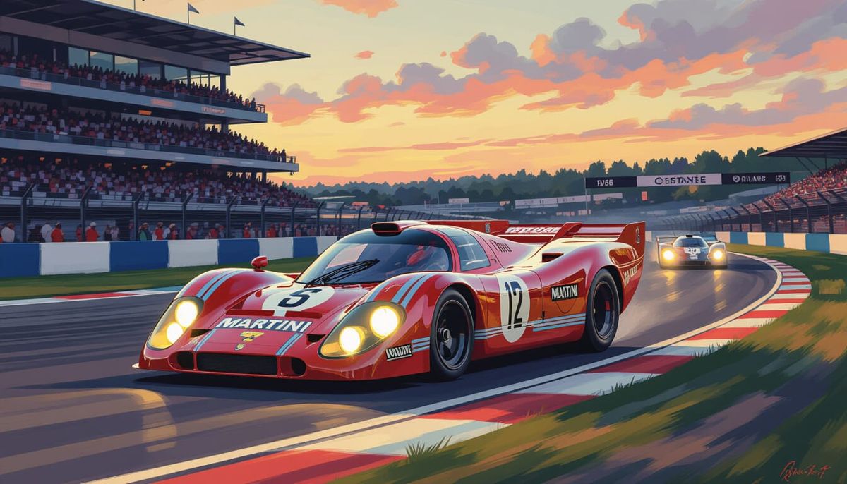 This image shows a vintage Porsche 917 speeding along the Le Mans track at dusk. The car features a Martini Racing livery, captured with smooth impasto techniques in a neo-impressionist style.