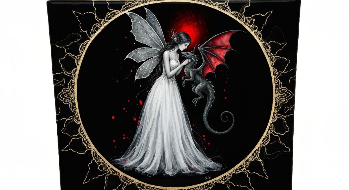 A striking picture of a fairy embracing a small dragon. The artwork is reminiscent of alcohol ink glasswork, with intricate gold edging, vibrant dark colors, and bold red accents, creating a blend of abstract and realistic elements.