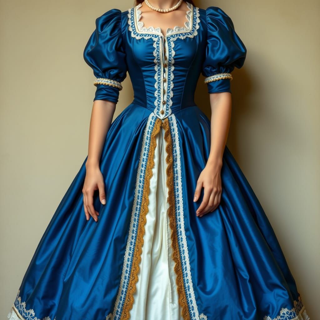 A full-body view of an elegant blue silk dress featuring puffed sleeves and a long skirt, detailed with white cording and gold lace. Rendered with rich detail and vibrant colors in a Pre-Raphaelite aesthetic.