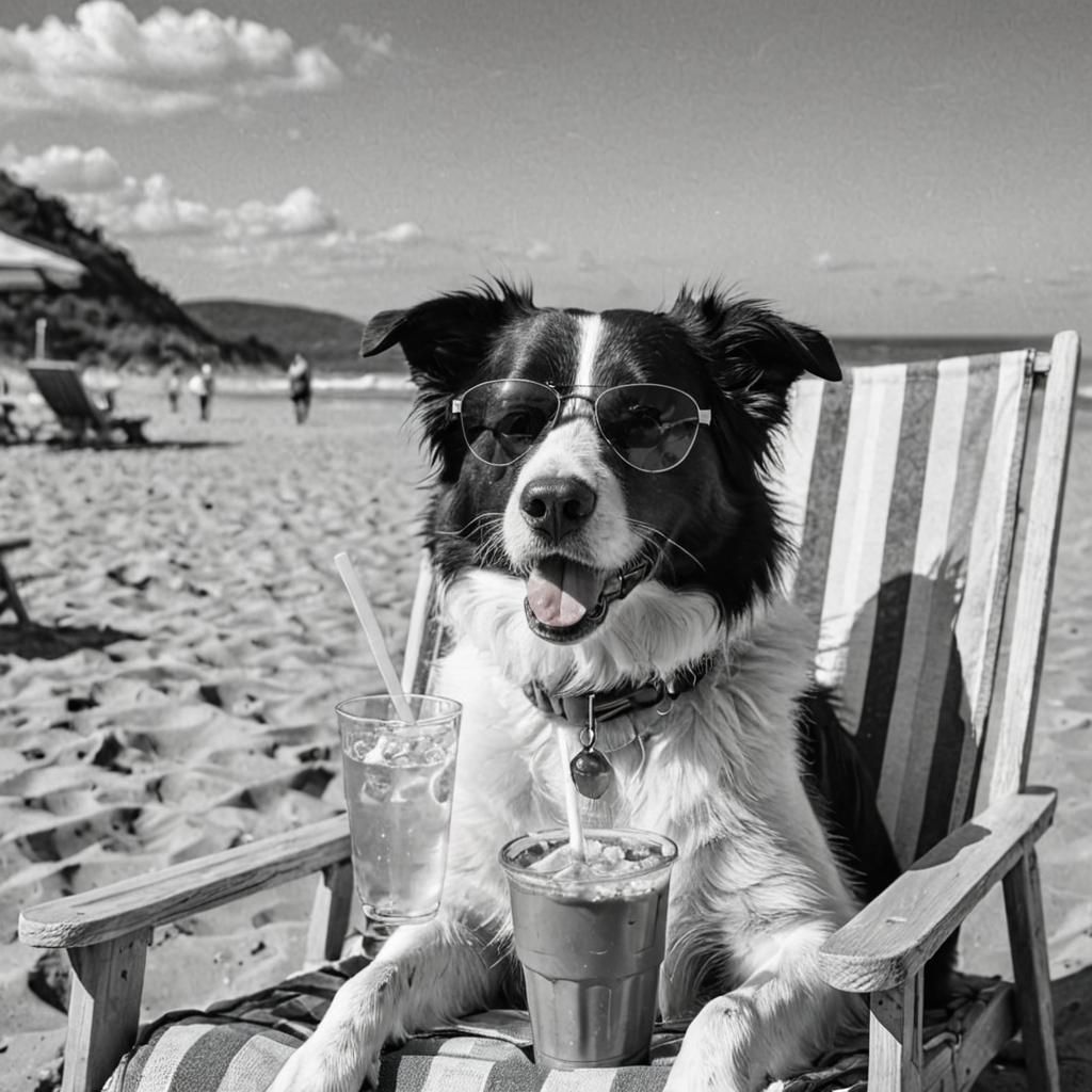 A monochrome portrait of a border collie enjoying a day at the beach. The dog is relaxing in a beach chair, wearing sunglasses and holding a drink, in a simple black and white aesthetic.