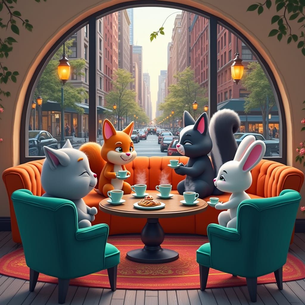 This image shows a group of cartoon animals enjoying coffee in a New York cafe. The scene, rendered as 3D digital art, captures a storybook-like view of friendship in the golden light of spring.