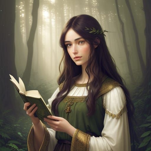 This image depicts a halfing druid in a mystical forest setting, surrounded by stacks of old books and bathed in warm golden light. The scene is characterized by rich textures, earthy tones, and intricate patterns, evoking a sense of fantasy realism and mysticism.