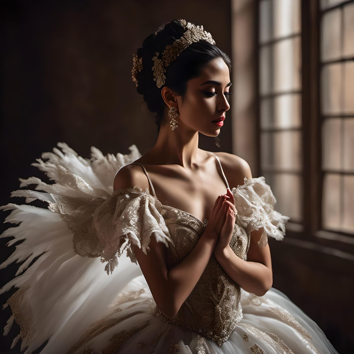 This image shows a stunning portrait of a young Mexican ballet dancer. The artwork captures the dancer's beauty and grace in a surreal and captivating manner.