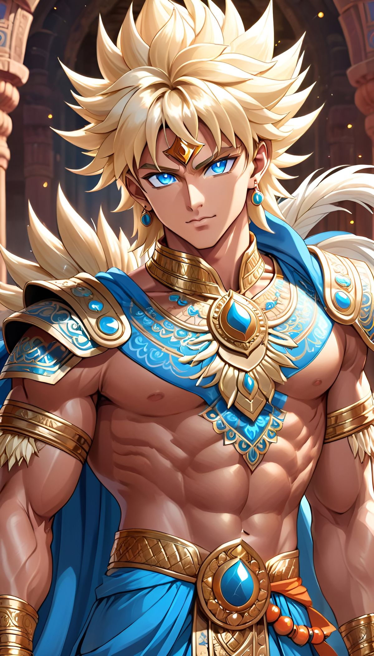 This image shows a handsome, muscular man with tan skin and blue eyes, dressed in traditional Indian Hindu clothing. The figure embodies a Hindu god reincarnation in an intricately detailed style.