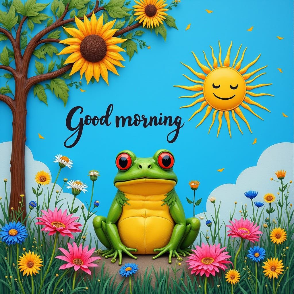 A vibrant image of 'Good Morning' written across a blue sky, with a bullfrog, dahlias, cornflowers, dandelions, and grasses beneath a sunflower tree, as pop surrealism.