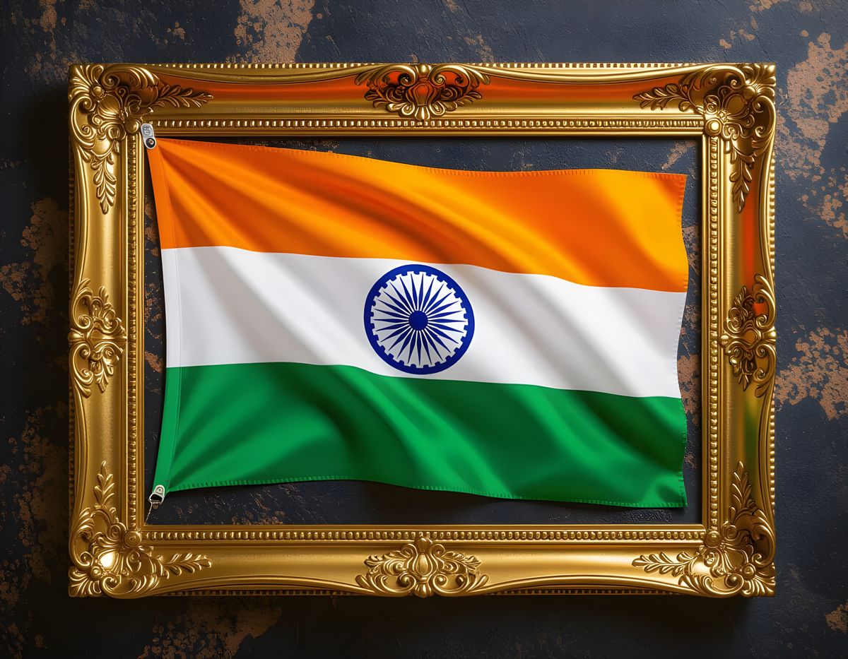 This image shows the Indian flag waving within an ornate golden frame against a richly textured backdrop. The saffron, white, and green silk fabric and royal blue Ashoka Chakra are rendered with premium lighting in ultra-realistic 8k.
