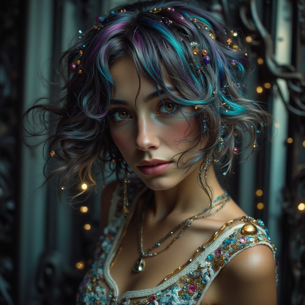 This image shows an ultra-emotional woman with an asymmetric haircut on a train, captured in dramatic cinema lighting with bright, contrasted colors. Features detailed skin and textures.