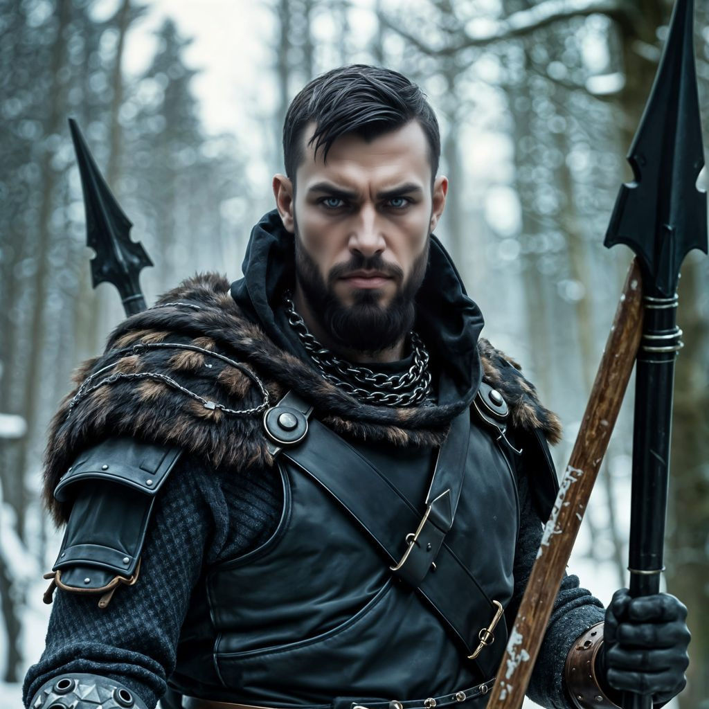"High fantasy epic attractive male barbarian warchief, short slick black hair, black goatee, pale skin, leather and chainmail armor, wolf hood, spear, scenic winter forest background, high detail, high quality, correct anatomy, Cinematic film still, shot on v-raptor XL, film grain, vignette, color graded, post-processed, cinematic lighting, 35mm film, live-action, best quality, atmospheric, a masterpiece, epic, stunning, dramatic"
