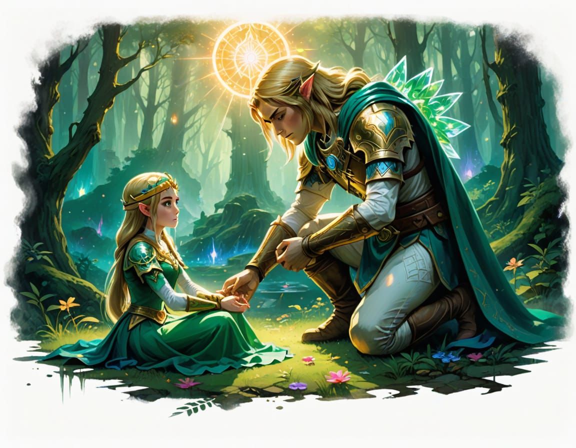 A divine, luminous figure gently cradles an injured Princess Zelda's arm amidst a misty emerald forest. This vibrant oil painting captures a moment of healing with ethereal light and warm, cinematic glow.