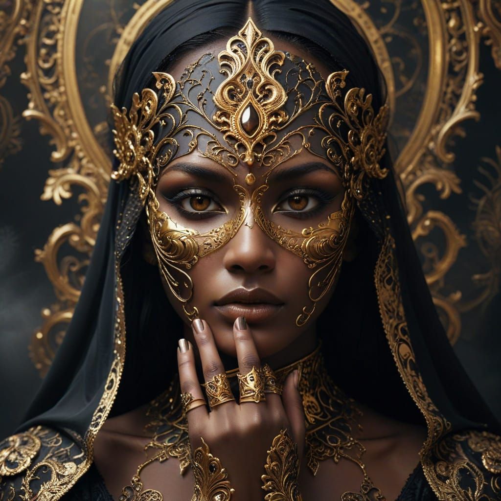 This stunning portrait features a mysterious woman with dark skin and a golden ornate mask, set against a dark, dramatic background. Her golden eyes and elegant fingers exude an air of sophistication and luxury, amidst intricate patterns and soft, high-contrast lighting.