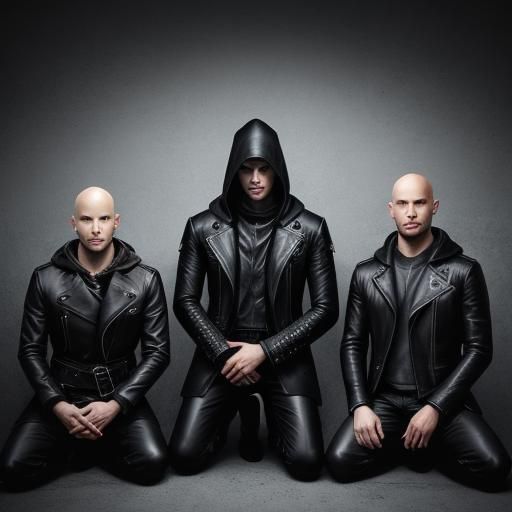 This image depicts three attractive, bald, 35-year-old gay men in leather attire within a dungeon setting, awaiting a newcomer. The artwork showcases hyperrealistic details and a dramatic composition.