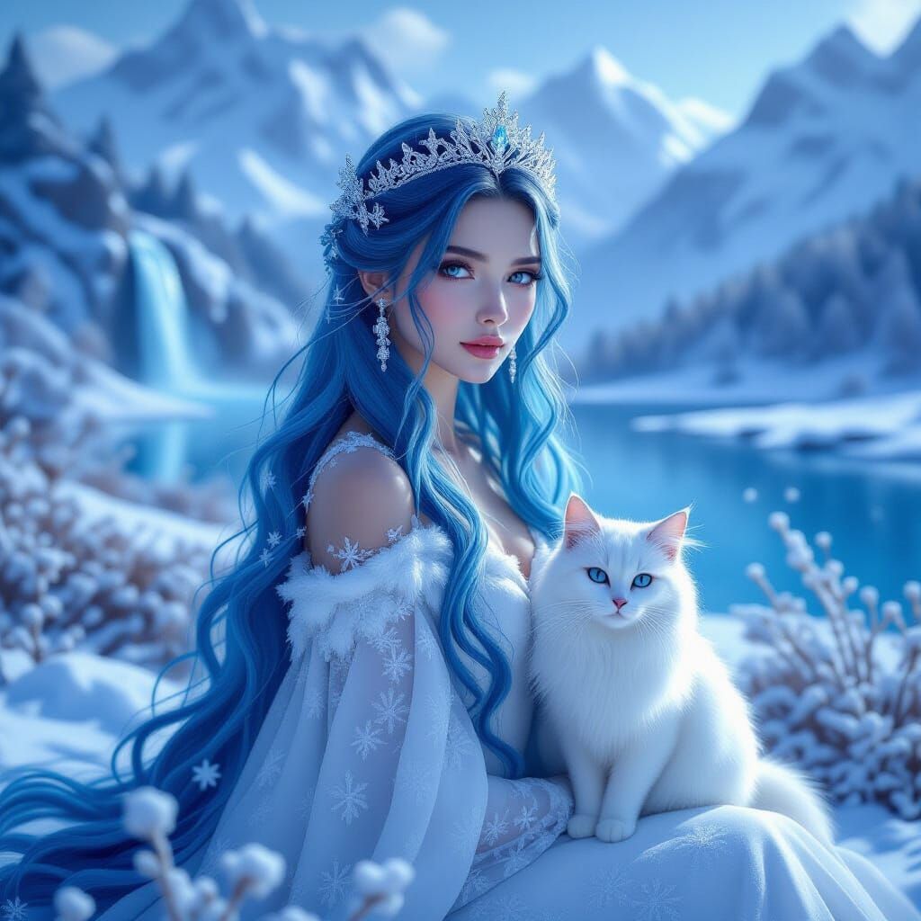 Един сезон като ефирно мистично създание. Да се вижда лицето и. Да се намира на поляна със зимни тонове и в центъра на поляната да има олтар да е с дълга синя коса с диадема от диаманти и бяла рокля от снежинки. В далечината езеро, водопади и планини. До нея да има голяма блестяща бяла котка.