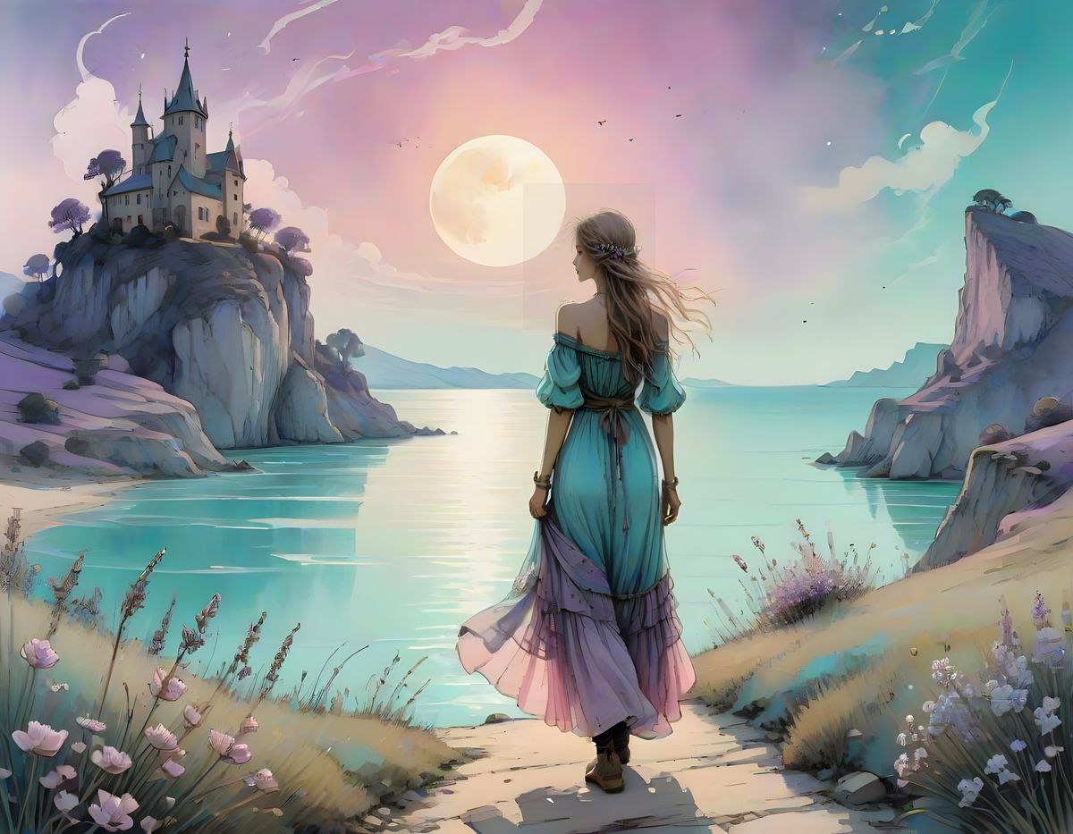 This image shows a free-spirited girl in a bohemian dress gazing out at a serene turquoise sea under a majestic purple moon, surrounded by jasmine flowers falling from the sky and distant pink cliffs, in a whimsical and romantic style reminiscent of Impressionism
