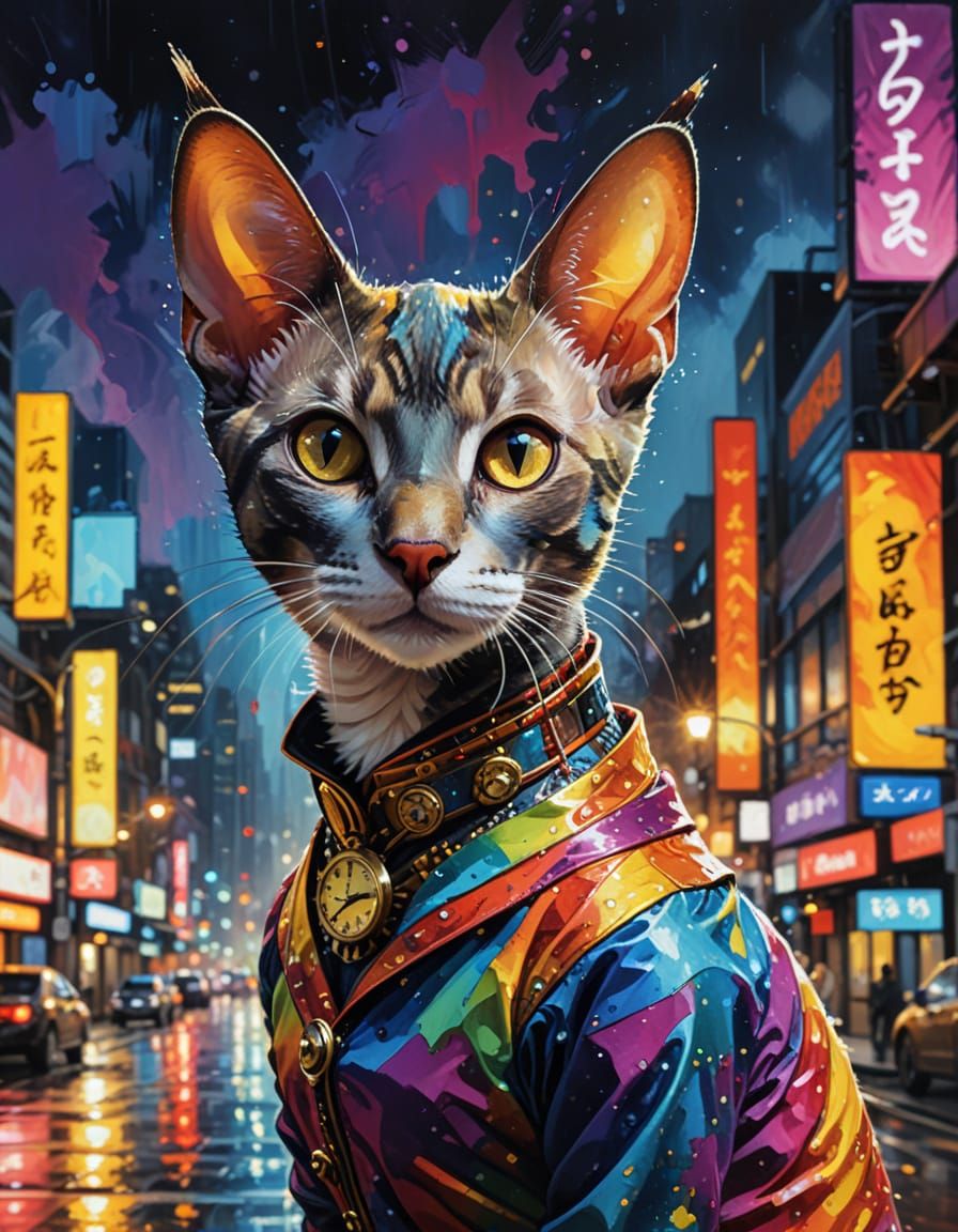 This image shows a steampunk oriental shorthair cat in a rainbow dress exploring a Tokyo night city. Rendered in an abstract expressionist style with bold brushstrokes and vivid colors.