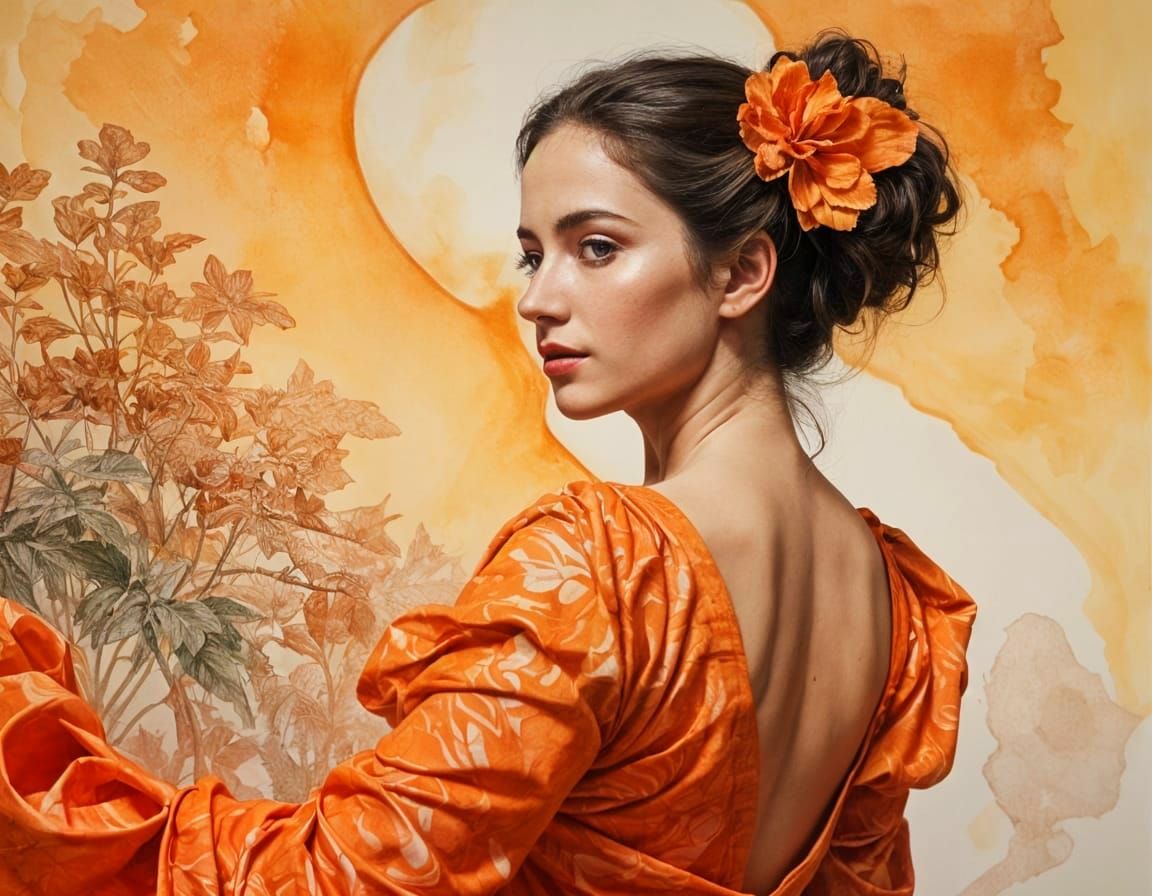 A dynamic portrait of a flamenco dancer set amidst an op art landscape with amber tones, blending elements of glitchcore and watercolor styles, reminiscent of Indian and African folk art traditions.