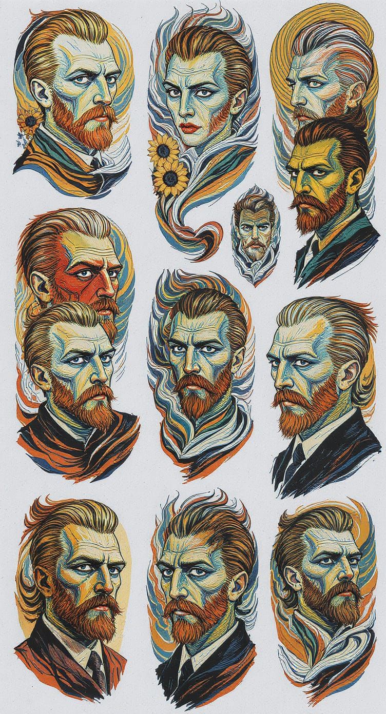 This image shows a flash tattoo sheet of portraits inspired by post-impressionism. Bold brushstrokes and vibrant colors create expressive faces against swirling backgrounds in a blend of tattoo art and digital painting.