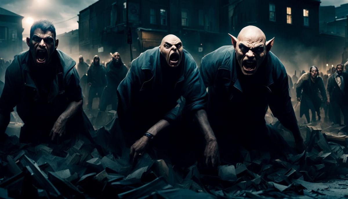 This image shows an angry crowd protesting in a city street. The cinematic still features dramatic lighting, ominous shadows, and high contrast colors in a dark, moody art style.