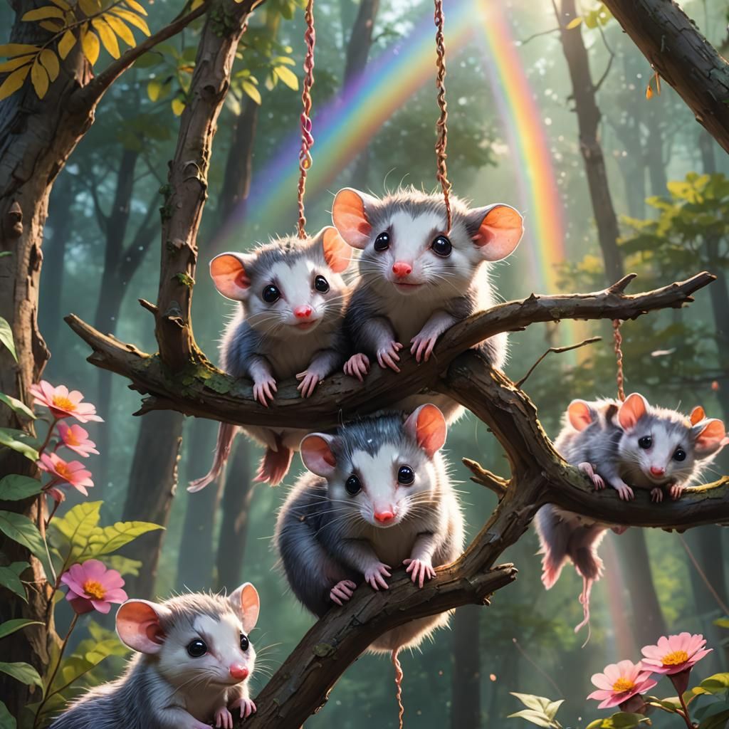 This image shows a group of baby opossums clinging to their mother's back in a forest clearing. A rainbow arcs across the sky in this 3D anime style rendering with soft morning light and a gentle color palette.