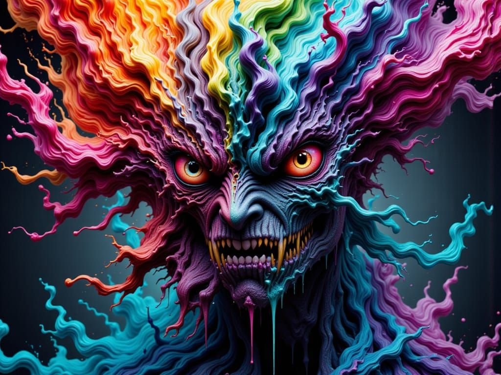 This image features a disturbing, multi-colored inkblot portrait with intricate details and dramatic lighting, rendered in a high-contrast oil painting style.