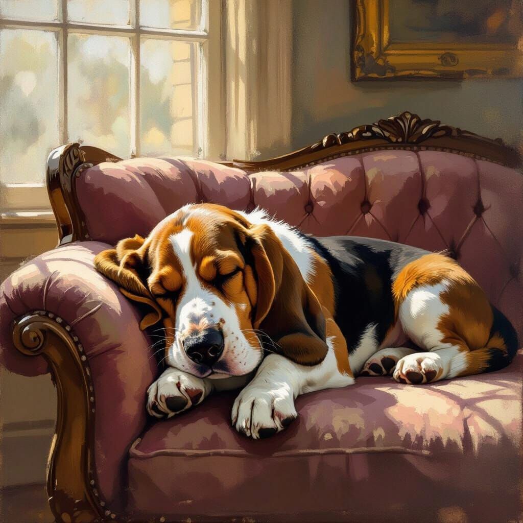 This image captures a Basset Hound resting on an antique chaise lounge, bathed in sunlight. The artwork features a soft, impressionistic style with a warm, muted color palette, evoking intimacy and tranquility.