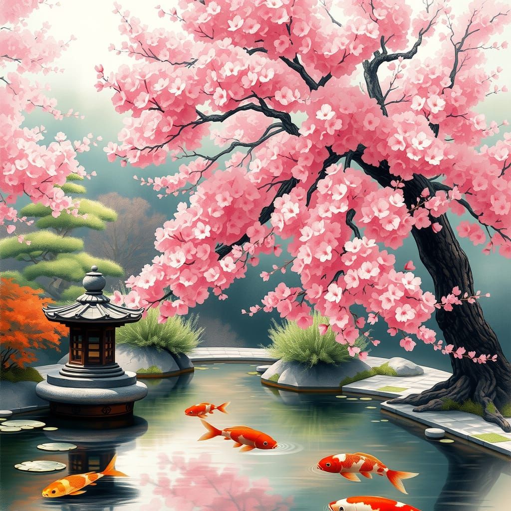 A serene Japanese garden featuring a koi pond, stone lantern, and cherry blossom tree. Impressionistic style with soft brushstrokes, warm pinks, rich greens, and shimmering golds.