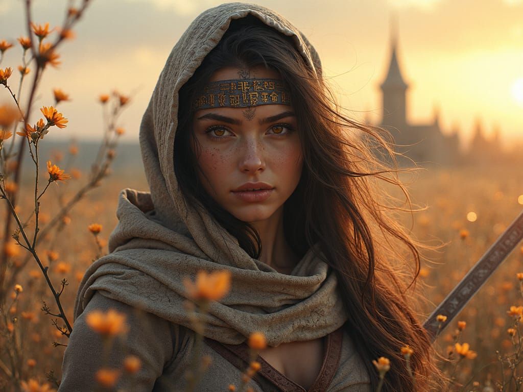 A striking image shows a resilient young female paladin warrior with windswept hair and intense eyes. The artwork, rendered as an oil painting on cracked canvas, incorporates light and bokeh orbs.