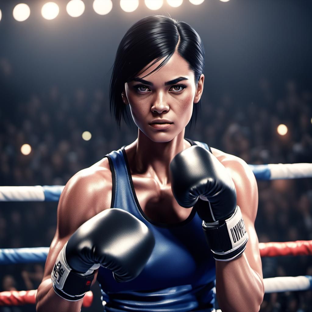 This image shows a beautiful female boxer with black hair in a dynamic pose. The artwork uses realistic rendering techniques to create a cinematic feel.