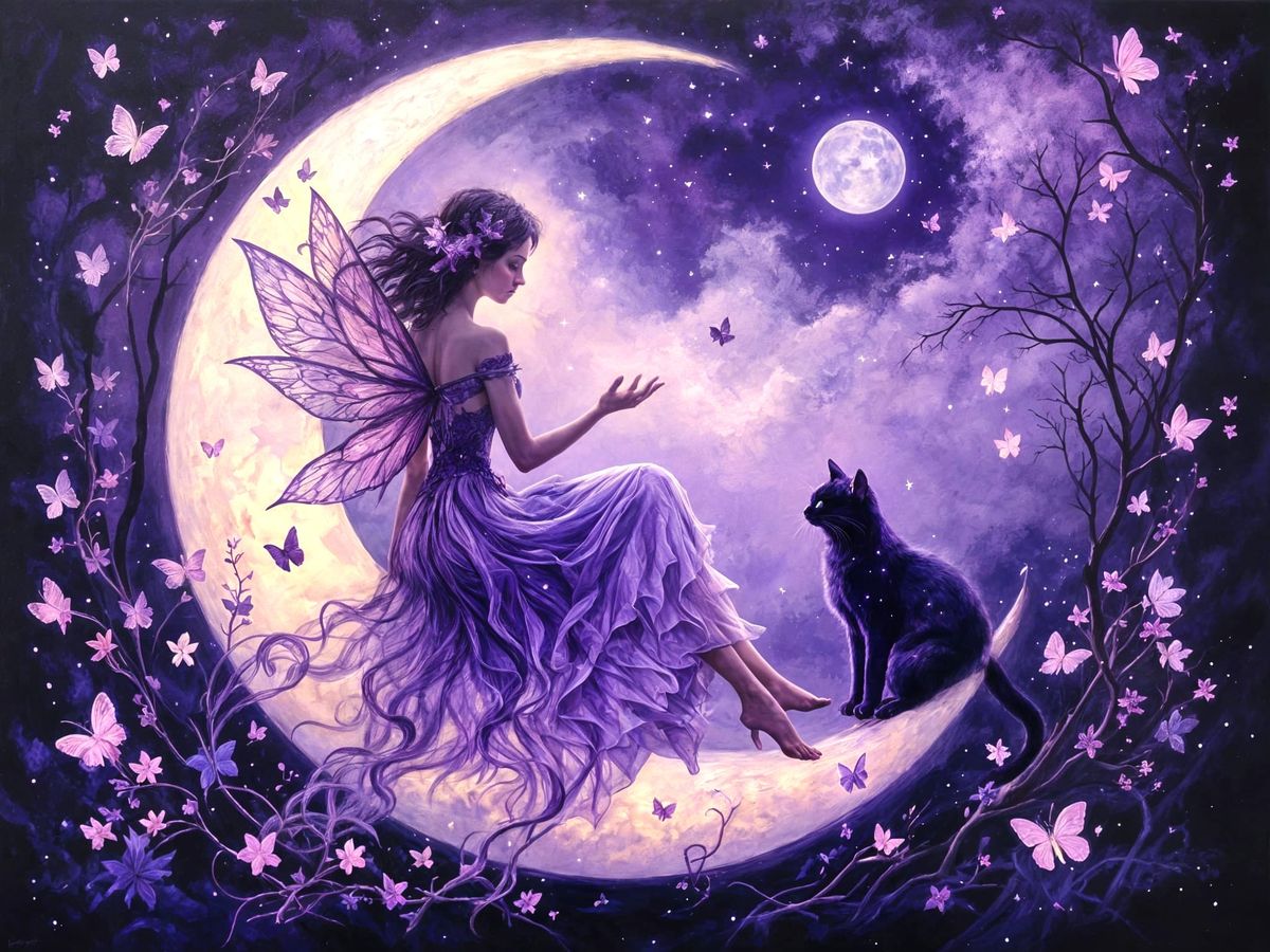 This enchanting oil painting depicts a delicate fairy amidst a majestic crescent moon, accompanied by a curious cat and delicate butterflies, all set against a rich purple backdrop.