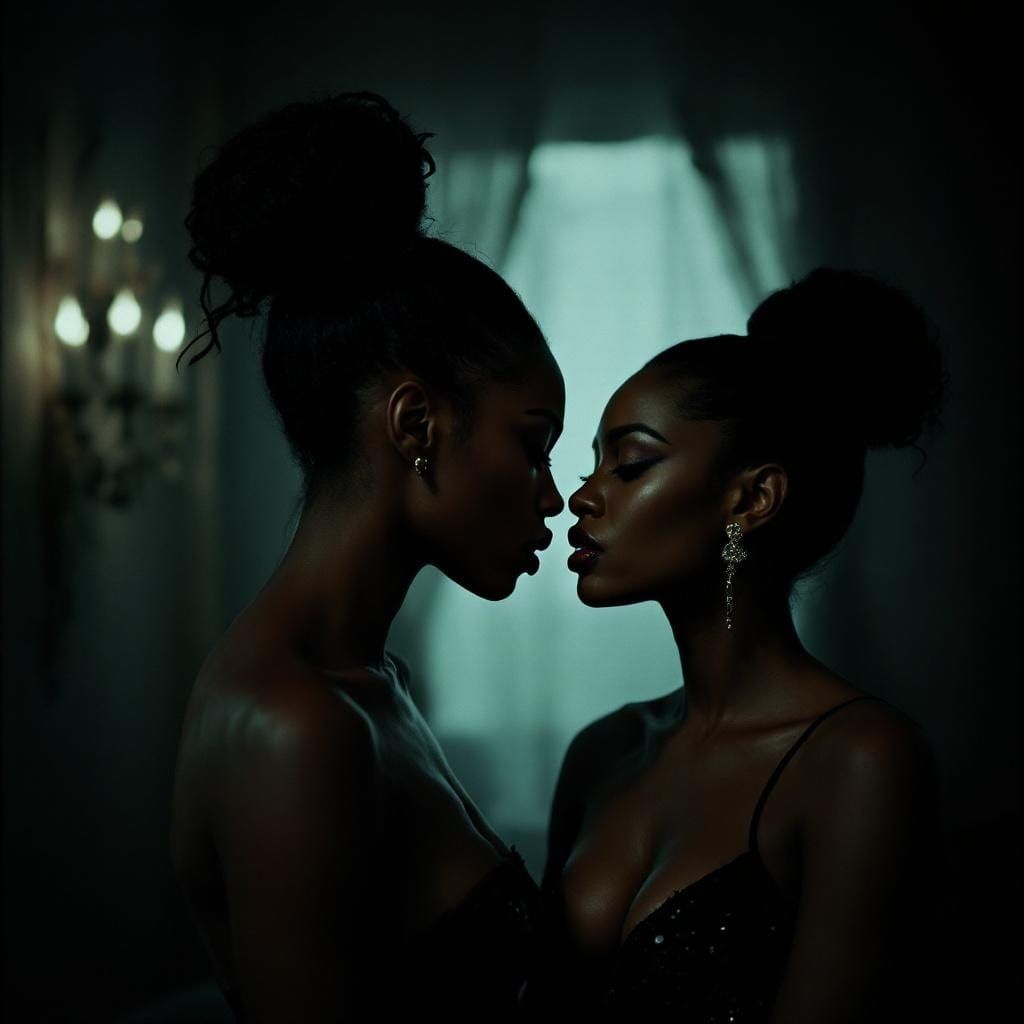 A cinematic image of two Black women in elegant dresses enduring an emotional breakup. The scene uses dramatic lighting and film grain to convey anguish and despair in a moody atmosphere.