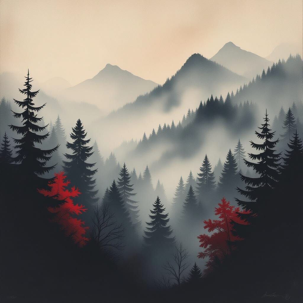 This image captures a minimalist, hazy autumn mountain forest scene with high contrast and elegant, ethereal details. Rendered in an ink wash technique on weathered parchment, it evokes mystery and depth.
