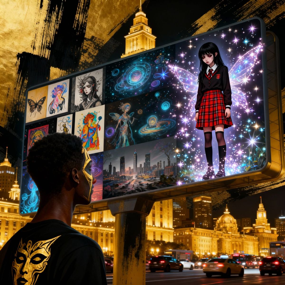 This image shows a goth girl in a school uniform discovering visions of her future art on a city billboard, offering hope and easing her sadness.
