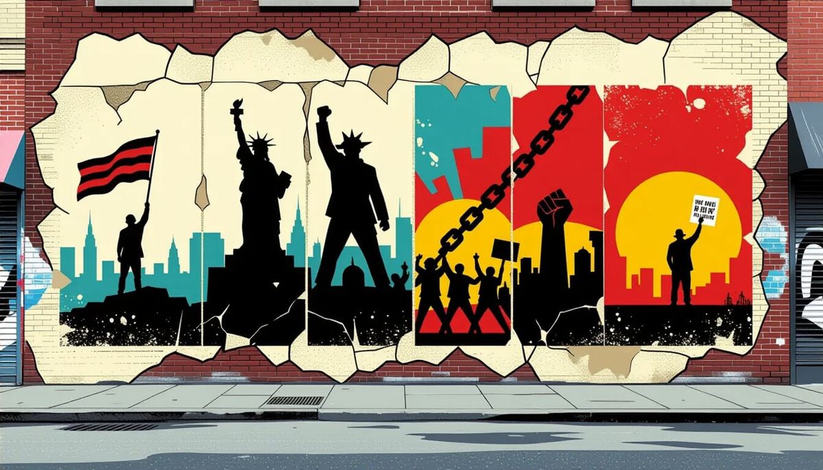 This image showcases a large-scale urban mural in a gritty city street, painted in the distinct graphic style of Shepard Fairey. It depicts a powerful narrative of revolution across six panels.